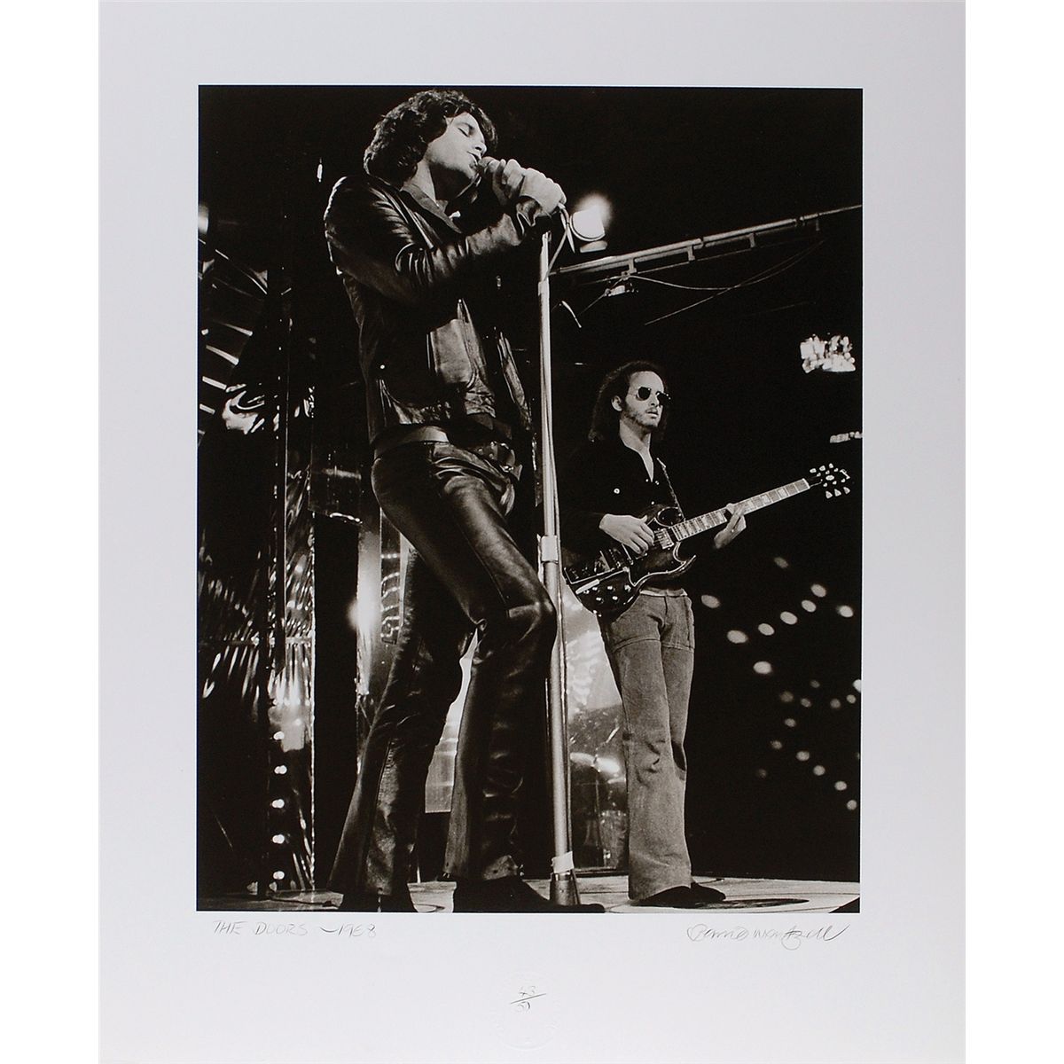 Limited edition photo of Jim Morrison and Robby Krieger on stage with the Doors in 1968 on a 16 x 20 sheet of Kodak’s highest quality Silver Gelatin paper, #43/50, signed in pencil along the bottom by Wentzell and also bearing an embossed Wentzell seal. In fine condition.