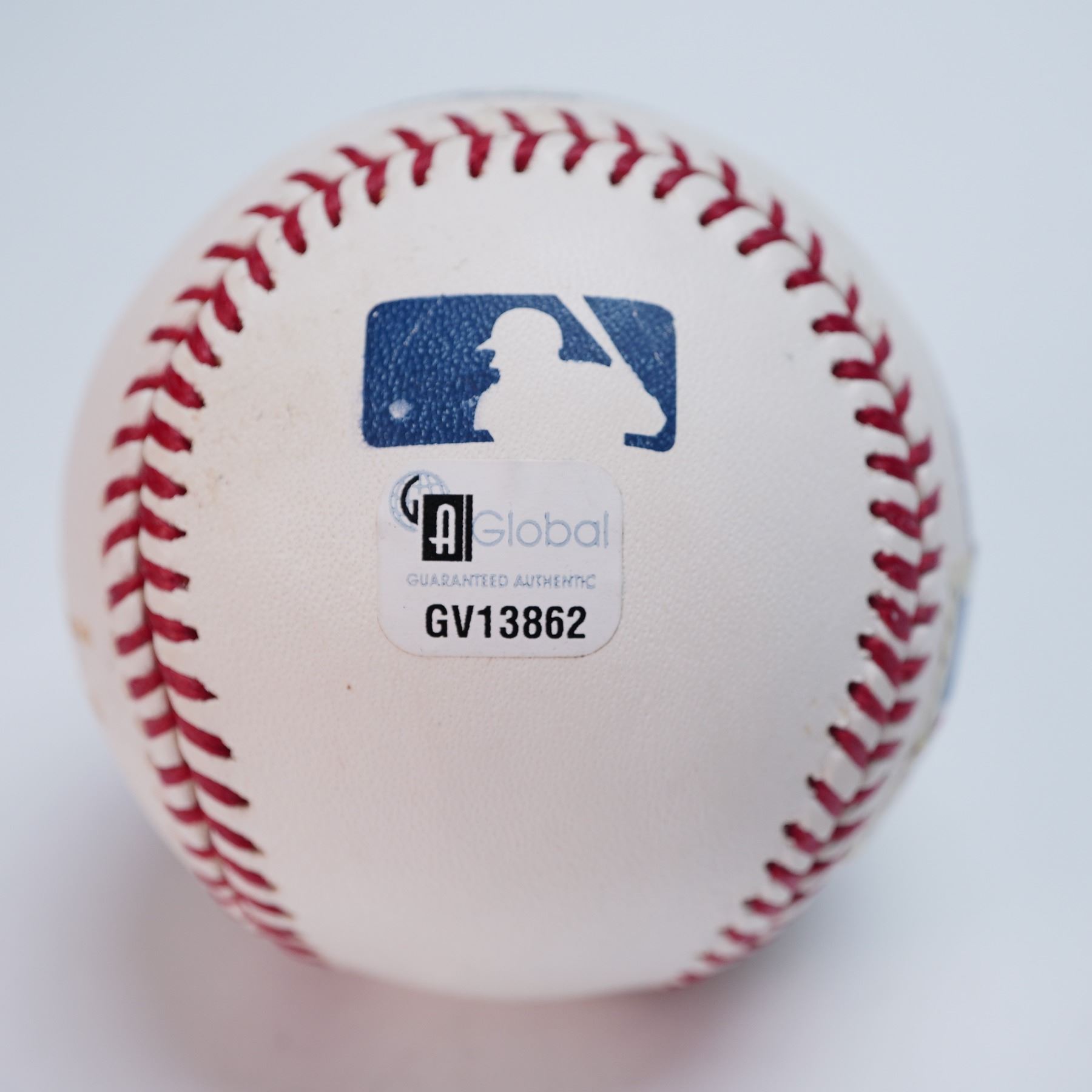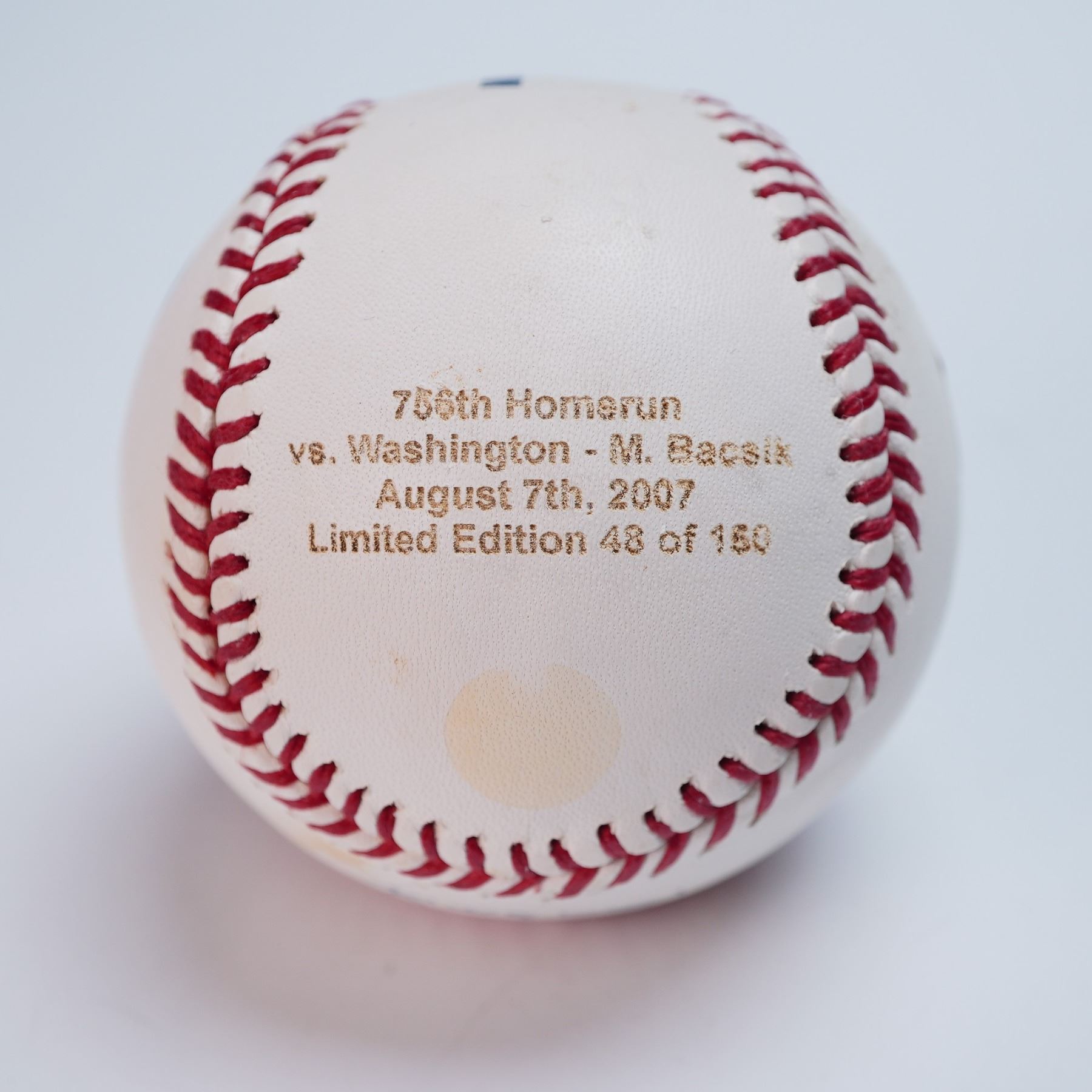 This baseball is a commemorative item celebrating Barry Bonds' historic 756th home run, hit on August 7, 2007, against the Washington Nationals. It features Bonds' signature and the engraved text 756th Home Run vs. Washington - M. Baezik August 7th, 2007 Limited Edition 48 of 150. The ball is also stamped with the official MLB logo and includes a holographic sticker for authenticity. With an added postmark dated August 7, 2007, and stamps featuring American flags, it marks the achievement with a collectible touch. The ball measures approximately 3"dia.