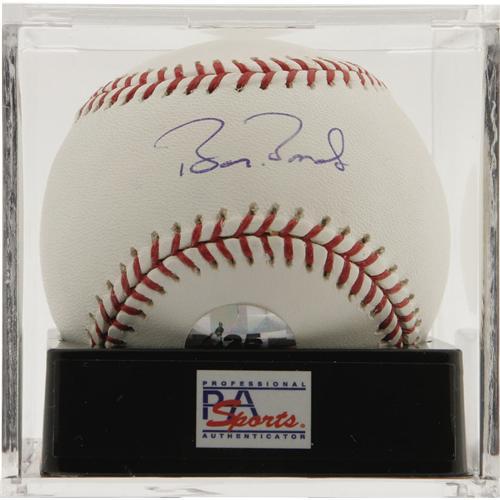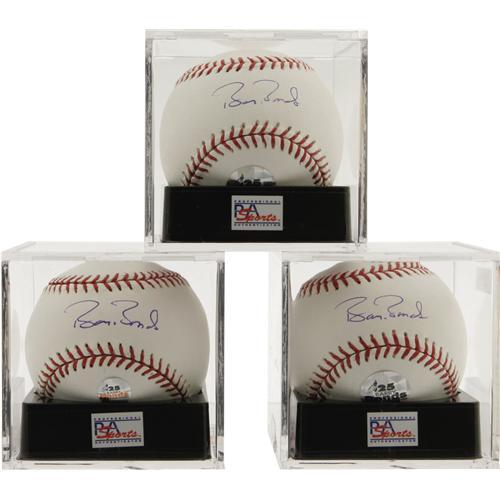 <B>Barry Bonds Single Signed Baseballs Lot of 3, All PSA Gem Mint 10.</B></I> Trio of Bonds singles, each affixed with his personal holographic authenticating sticker, are deemed unimprovable by the highly critical graders at PSA. Each OML ball is flawless, as are the sweet spot blue ink signatures found upon them. The balls are "slabbed" in sealed grading cubes, each with its own Certificate of Authenticity. Will he become the career Home Run King? If he does, the owner of these balls will be very happy. <I>COA's from PSA/DNA.</B></I> <BR><BR><B>Important notice:</B> Heritage usually auctions material at the rate of 200-250 lots per hour. On some occasions eBay Live bid software or the Internet may not be able to keep up with the pace of the auction. We recommend placing a realistic absentee bid now as insurance to avoid disappointment. Occasionally the auctioneer may eliminate or reject an eBay Live bid, and the auctioneer may also reopen a lot after the close of the eBay live bidding (usually because we missed an audience bid), and may reject your bid even if it shows you as the winning bidder. By bidding via eBay Live, you agree that Heritage may award the lot to another bidder at its sole discretion under the circumstances described above or any other reasonable circumstances. Since eBay bids are not shown to us until we open the lot on the floor, we treat those bids just like floor bids. In most cases the floor responds before the eBay bid is presented to us, due to Internet lag time, so for consistency we have made it a policy that floor bids are always considered first over tie eBay live bids. Also please note that all Heritage lots purchased through eBay Live carry a 22.5% Buyer's Premium. Please make sure you read the Terms and Conditions before you bid. This lot is being auctioned in conjunction with a live floor auction by Heritage Galleries & Auctioneers. All final auction and invoice information will be supplied by Heritage Galleries & Auctioneers, and all other information should be considered preliminary. Lot:19047 <BR><BR><B>Winning Notification and Billing:</B> After the FINAL session in this auction is complete, Heritage will send e-mail and snail mail invoices. This process normally takes several days. All final auction and invoice information will be supplied by Heritage Galleries & Auctioneers, and all other information should be considered preliminary. <BR><BR>This auction will be conducted on a live auction floor and over the Internet through eBay Live. If you choose to place an absentee bid, please take a moment to <font color='#0000ff'><u><a href='http://pages.ebay.com/liveauctions/help/before/laabsentee.html'>learn how eBay Live absentee bidding works</a></u></font><font color='#000000'>
