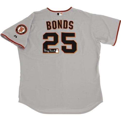 <B>Barry Bonds Signed Jerseys Lot of 5.</B></I> If you're betting on Barry to overtake Hammerin' Hank next year then now is the time to invest in these fine replicas of his San Francisco Giants gamers, each signed in 10/10 sharpie. Three are road grey, two are home white, and all bear the holographic authenticating sticker of Major League Baseball. A terrific dealer's lot for those with strong Northern California connections. <I>LOA from PSA/DNA.</B></I>