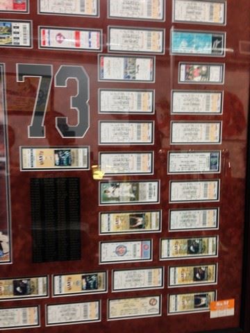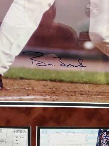 Barry Bonds - one of the most famous New York Giants and Pittsburg Pirates of all time who played 22 seasons in major league baseball. This is an amazing, custom framed and signed photo displayed with 60 season tickets from his 2001 season as a New York Giant. Framed in plexiglass. He received a record 7 NL MVP awards and 8 Gold Glove awards, he is considered to be one of the greatest baseball players of all times. Officially licensed by Photofile. (45x64)
