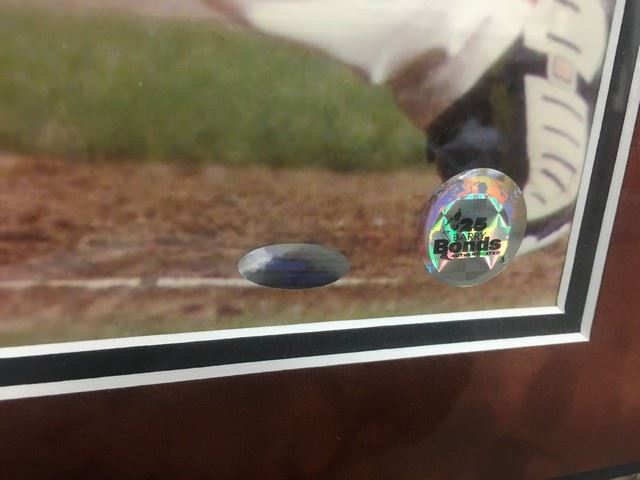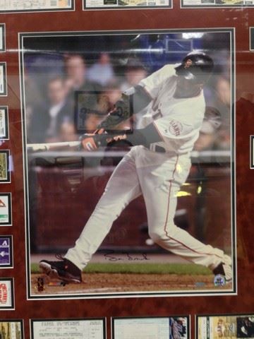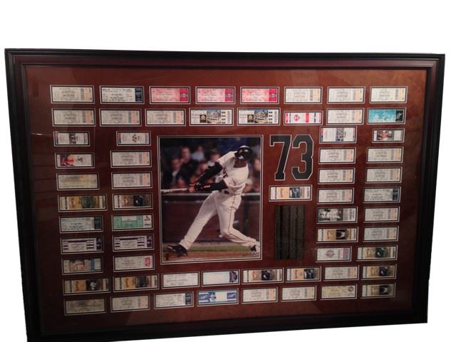 Barry Bonds - one of the most famous New York Giants and Pittsburg Pirates of all time who played 22 seasons in major league baseball. This is an amazing, custom framed and signed photo displayed with 60 season tickets from his 2001 season as a New York Giant. Framed in plexiglass. He received a record 7 NL MVP awards and 8 Gold Glove awards, he is considered to be one of the greatest baseball players of all times. Officially licensed by Photofile. (45x64)