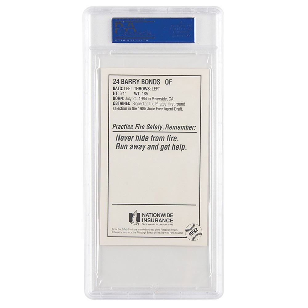 Color 3.5 x 5.75 Nationwide Insurance promo card showing Barry Bonds with the Pittsburgh Pirates in 1992, signed in black felt tip with his vintage signature. In fine condition. Encapsulated in a PSA/DNA authentication holder.