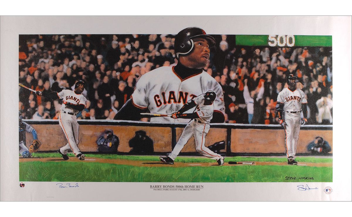 Color composite giclee print on canvas, 34.5 x 18.5, honoring Bonds’s 500th career home run, signed in the lower border in blue felt tip by Bonds and also signed by the artist, Steve Hoskins. Rolled and in fine condition.