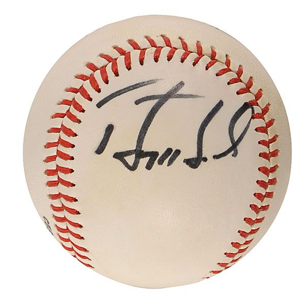Official Rawlings National League (Feeney) baseball signed in black felt tip on a side panel. Light scattered toning and a PSA/DNA label affixed to a reverse side panel, otherwise fine condition. Accompanied by a certificate of authenticity from PSA/DNA. A very early autograph from the controversial slugger.