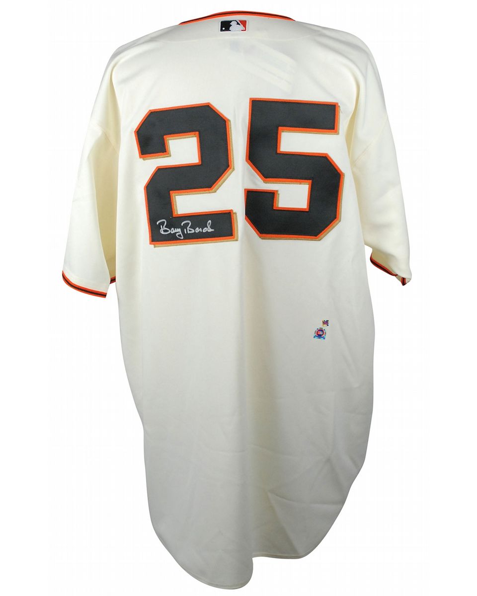 Official Russell Athletic replica San Francisco Giants baseball jersey, with sewn on letters and numbers, signed in silver ink on the number on the back. In fine condition. Accompanied by a certificate of authenticity from Bonds’s own company.