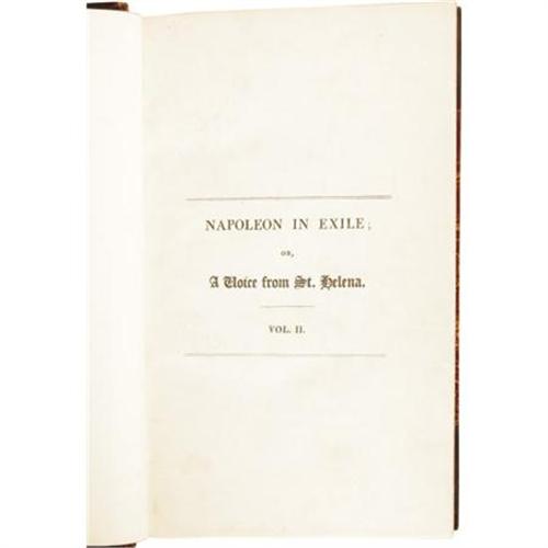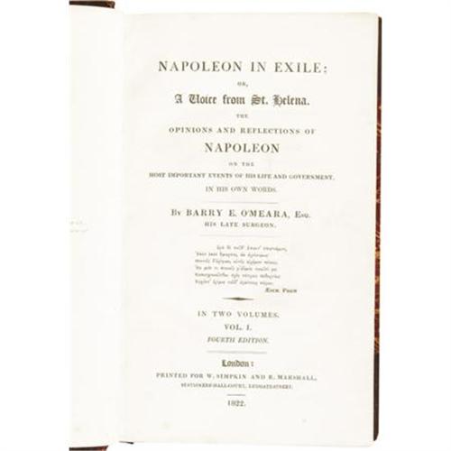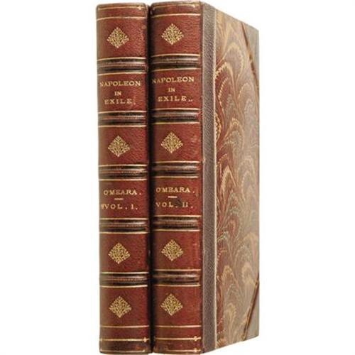 <B>Barry E. O’Meara, </B></I><B><I>Napoleon in Exile; or, A Voice from St. Helena</B></I></B></I> (London: W. Simpkin and R. Marshall, 1822), first edition, in two volumes, 512 and 542 pages, respectively, marbled endpapers and edges, spine and corners bound in black leather with marbled boards, 8vo (5.5” x 8.75”). Barry Edward O’Meara (1786-1836) was an Irish surgeon aboard the HMS <I>Bellerophon</B></I> when Napoleon surrendered to the British in July 1815. O’Meara accompanied Napoleon to his exile on St. Helena, where the erstwhile emperor died in 1821. The following year, O’Meara published this two-volume book, with the subtitle <I>The Opinions and Reflections of Napoleon on the Most Important Events of His Life and Government, in His Own Words</B></I>, claiming that Sir Hudson Lowe (1769-1844), an Anglo-Irish Major-General, had abused Napoleon after being appointed as his custodian. After the book was published, Lowe tried to prosecute O’Meara, but the public was squarely on the author’s side. Both volumes are in very good condition with minor wear on the leather bindings; a bookplate was removed from the inside front cover of each, where the residue remains.<BR><BR><b>Shipping:</b> Books & Catalogs (<a target="_blank" href="http://www.heritageauctions.com/common/shipping.php">view shipping information</a>)