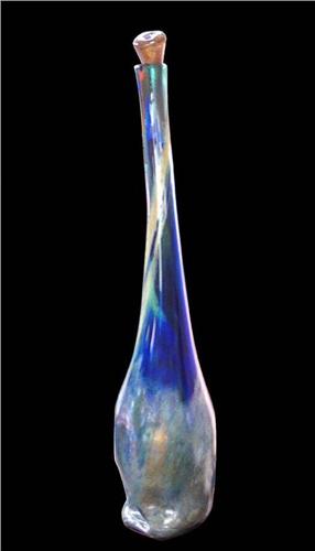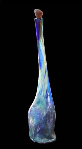 Barry Entner “Amphora” super magnum, hand-blown, freeform, glass vessel with glass stopper in shades of iridescent blue, green, and silver. Height 43 1/4", Diameter 10". Donated by: Violet Hill Studios.<p>Proceeds from the auction will go to benefit Santa Cruz, California glass artist Steven Lundberg, who, after 30 years of blowing glass locally, was diagnosed with amyotrophic lateral sclerosis, or ALS (Lou Gehrig's disease). This auction is a fundraising effort to help Steve meet the challenges of this disease.<p>Costs of treating ALS over a period of time can be exorbitant. In the short-term, Steve needs basic equipment such as an electric scooter and pointing devices to help him read and write.<p>Please join us for this auction, and help support a friend. Check out our other auctions to see the 150 paperweights, vessels, and glass sculptures from internationally known glass artists, donated by generous artists, galleries, and glass collectors from all over the country. Please contact us at 1-800-538-0766 or (831) 427-1177 for more information, or see <a href=http://www.selman.com/press target=_blank>www.selman.com/press</a>.
