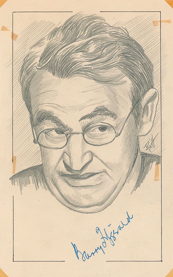 Original vintage signed pencil sketch of of Fitzgerald in glasses, done in an admirer’s hand, on an off-white 5 x 8 sheet, signed at the bottom in blue ink by Fitzgerald. Tape toning and remnants to corner tips and borders and two light horizontal folds, otherwise fine condition.