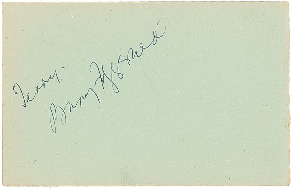 Vintage fountain pen signature and inscription, “Jerry, Barry Fitzgerald,” on a green 7 x 4.5 album page. Mild creasing to the bottom corners, toning around the edges, and light show-through from another signature on the reverse, otherwise fine condition.