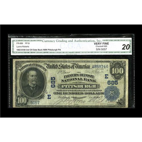 <B>Pittsburgh, PA</B></I> - $100 1902 Date Back Fr. 689 <B>The Farmers Deposit NB </B></I> Ch. # (E)685<BR>One of six of this type and denomination from here listed in the Kelly census, where it is classified as Fine. Certified as <B>CGA Very Fine 20</B></I> and displaying full strength officers' signatures, this elusive type will likely sell for...