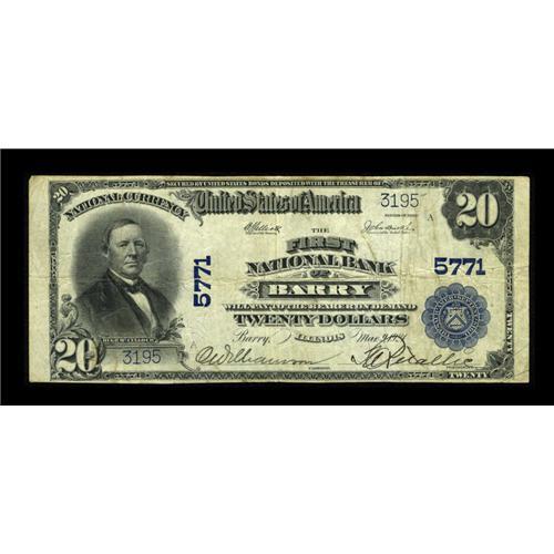 <B>Barry, IL</B></I> - $20 1902 Plain Back Fr. 659 <B>The First NB</B></I> Ch. # 5771<BR>Dark signatures grace the surface of this Pike County issuer. <B>Very Fine.</B></I><BR><I>From The Lincoln Collection</B></I><BR><BR><b>Shipping:</b> Coins & Currency (<a target="_blank" href="http://www.heritageauctions.com/common/shipping.php">view shipping information</a>)