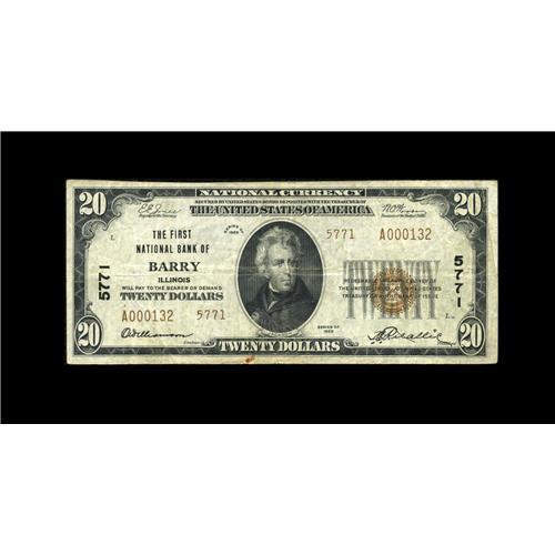 <B>Barry, IL</B></I> - $20 1929 Ty. 2 <B>The First NB</B></I> Ch. # 5771<BR>A third note from this scarce locale. Of the 12 small notes documented in the census this is only the second $20 type 2 to surface and is quite a prize for the Illinois specialist. <B>Very Fine.</B></I>