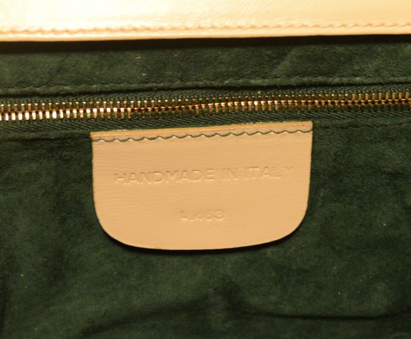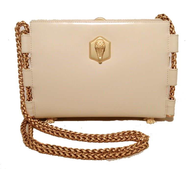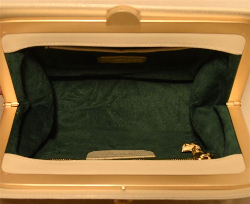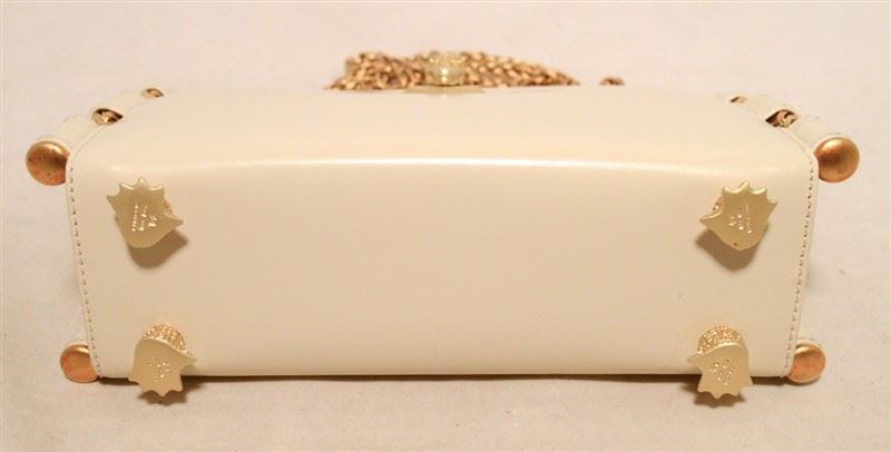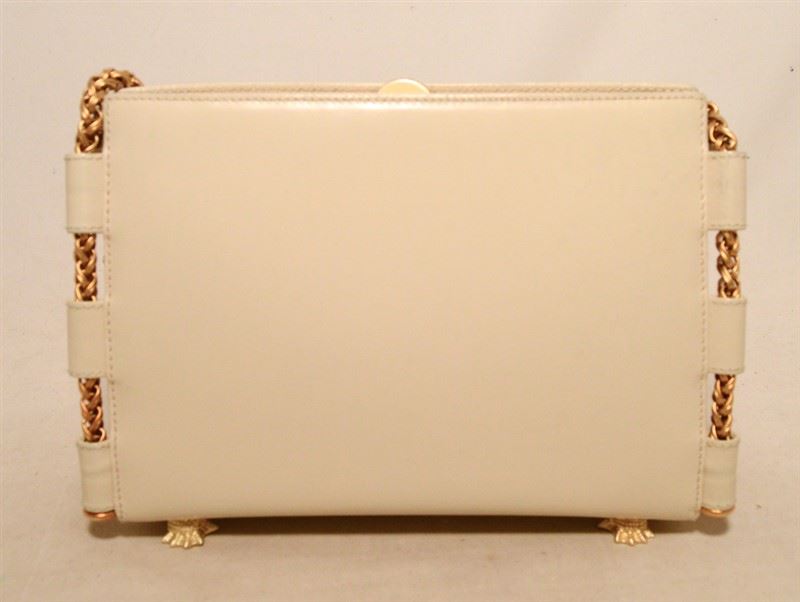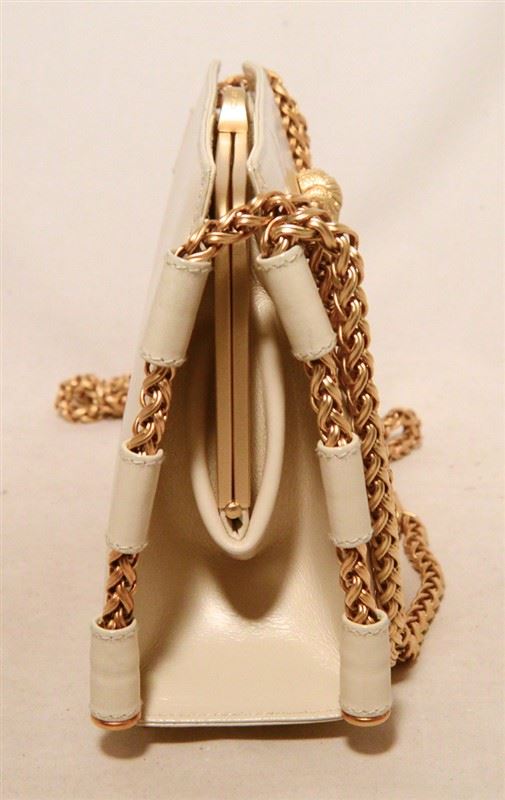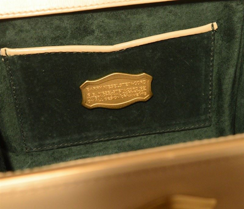 Beautiful Barry Kiselstein-Cord cream leather shoulder bag in excellent condition. Cream box calf leather exterior trimmed with matte gold hardware and a long chain shoulder strap. Top lifting closure opens to a dark green suede lined interior that holds 1 slit and 1 zippered side pockets. This piece is in excellent condition, no stains, smells, or scuffs. Clean corners, edges, and interior. Neutral color coordinates effortlessly with any wardrobe in any season. Purchase includes a dust cover. Measurements: 8"x6"x3" 17" strap drop #bags668