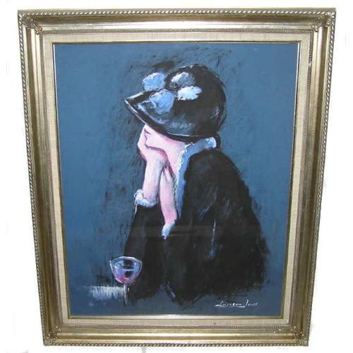 This is a lovely female mixed media portrait on heavy paper by the English painter Barry Leighton Jones (1932- ). Under glass in frame measuring 30 by 36 by 2 inches. Excellent condition. Colors are bright and vibrant and the work is flat. The artist employed watercolor and raised brush strokes (likely in acryllic) are apparant in his use of the color white. Given the abundance of Jones' prints (and unauthorized reproductions) of his clown art on the market, this work is refreshing and unique. He has depicted an attractive woman in a handsome dark coat and matching hat, circa 1920s or 1930s. She is seated at a cafe table, gazing into the distance with a half-empty wine glass beside her.
