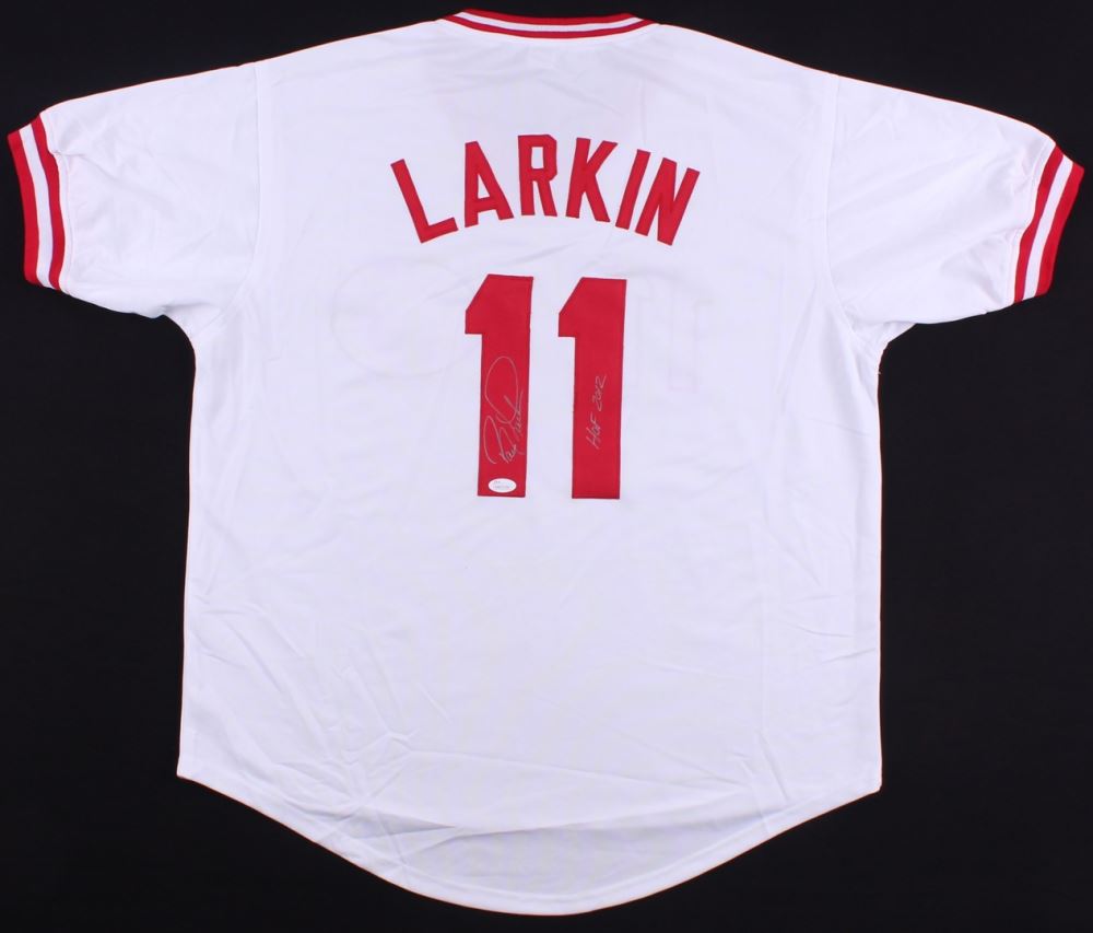 Custom on-field style jersey. Size XL. The jersey is hand-signed and inscribed in silver paint pen by Barry Larkin (HOF). Please note, the jersey has minor staining.