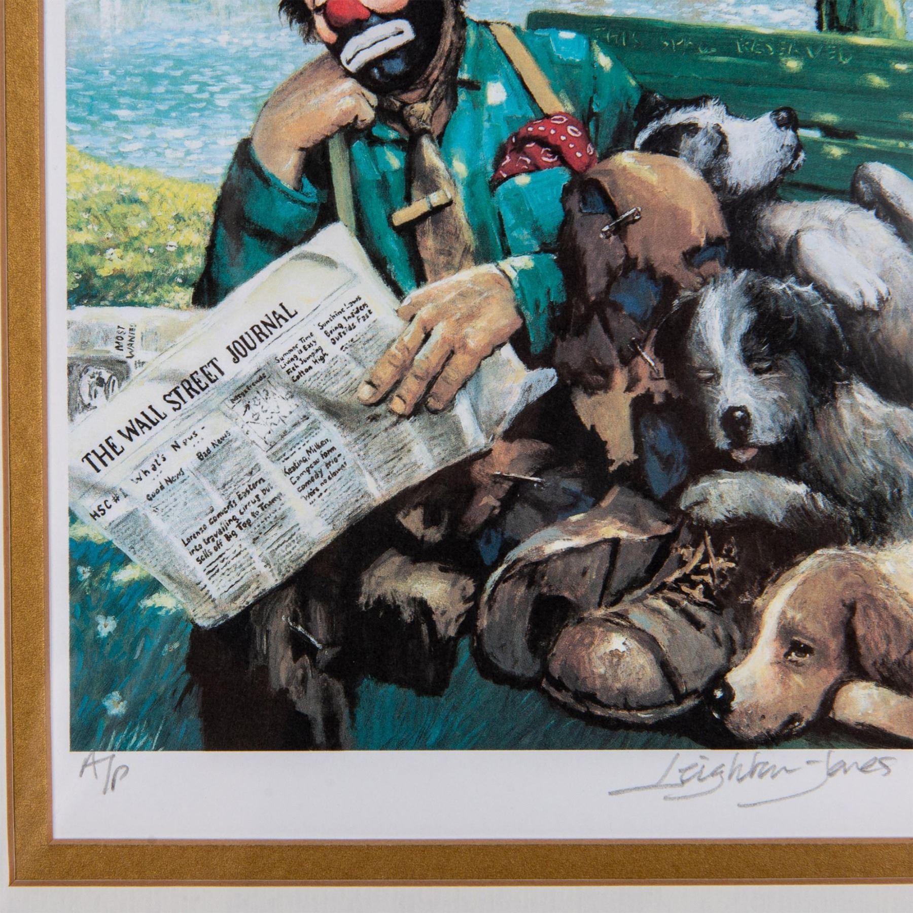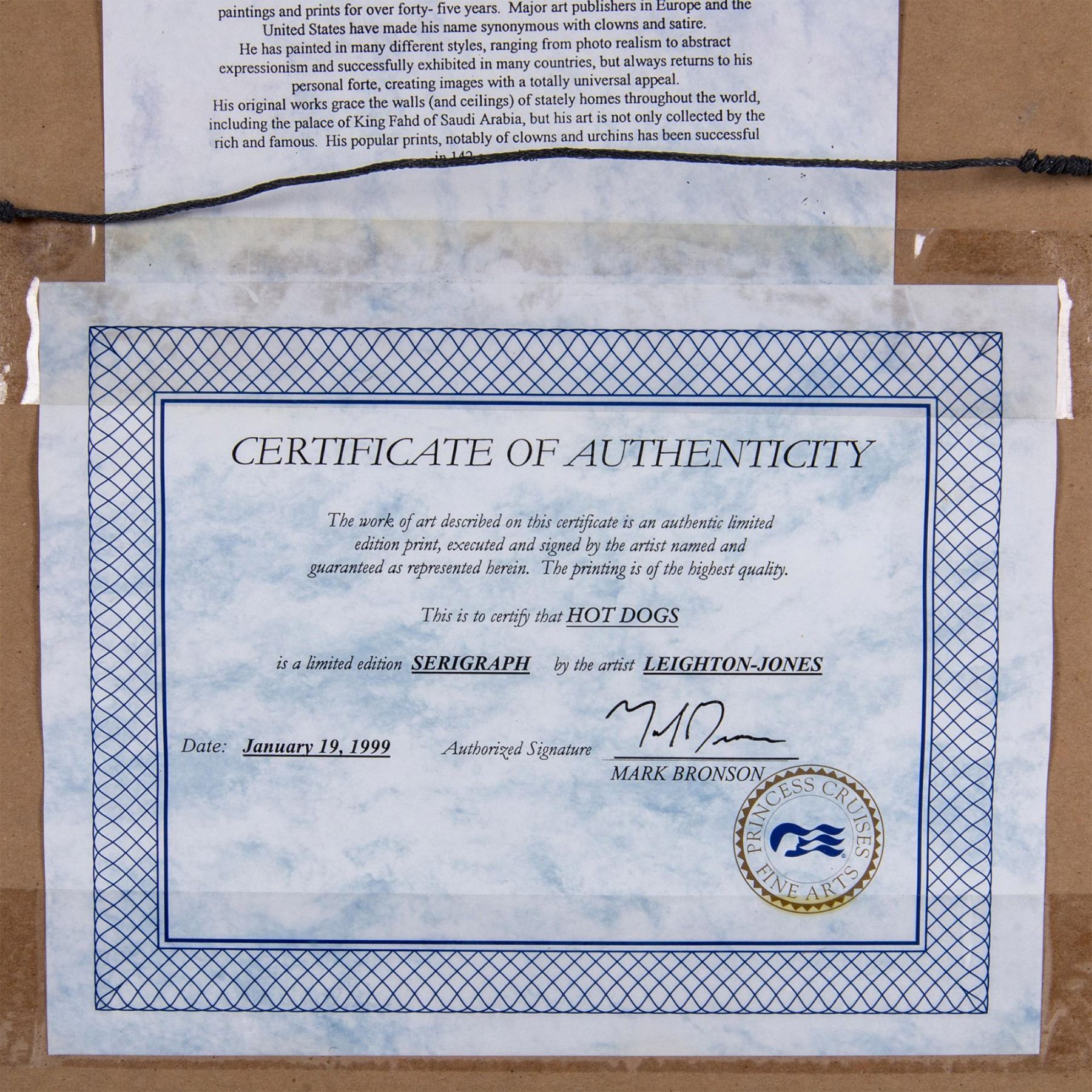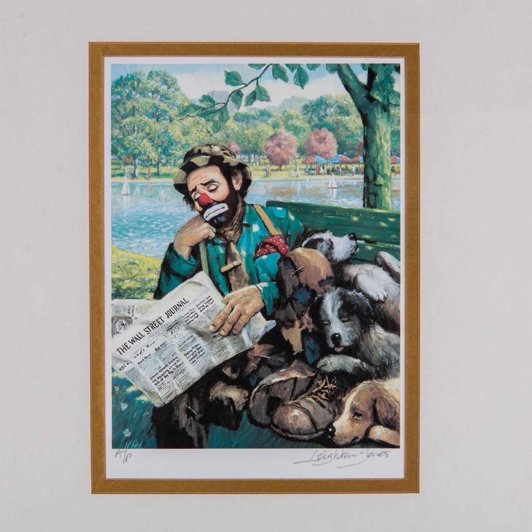 Limited edition color serigraph on paper entitled Hot Dogs by British artist Barry Leighton-Jones depicting a clown in a park with his dogs. Graphite signature on lower right: Leighton-Jones. Edition number on lower left: A/P (Artist Proof.) Housed in a marbleized frame with a white mat. Sight size: 6"L x 8.75"H. Frame dimensions: 14.75"L x 17.25"H x 0.75"W. Certificate of Authenticity included. Artwork can be unframed and rolled for shipment.