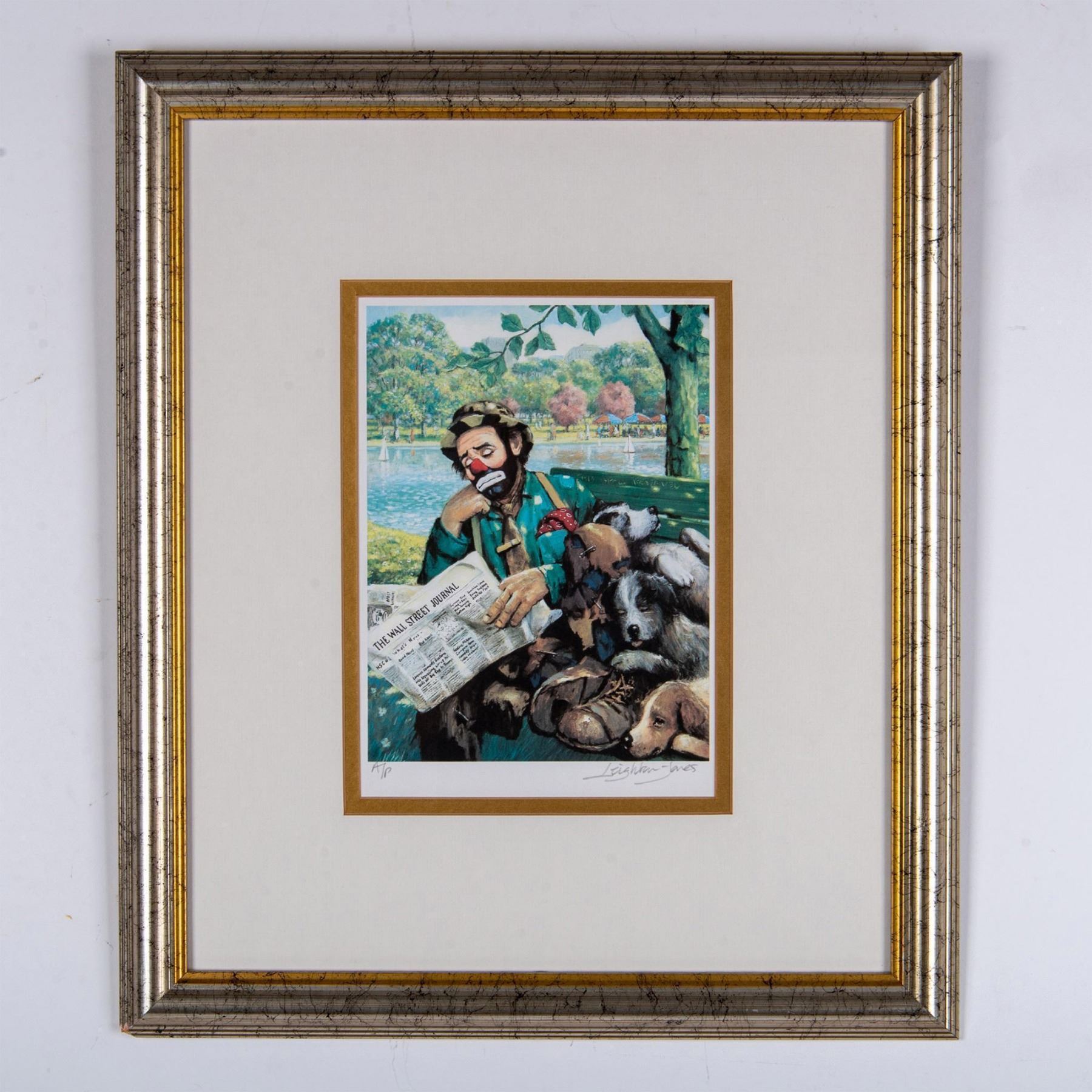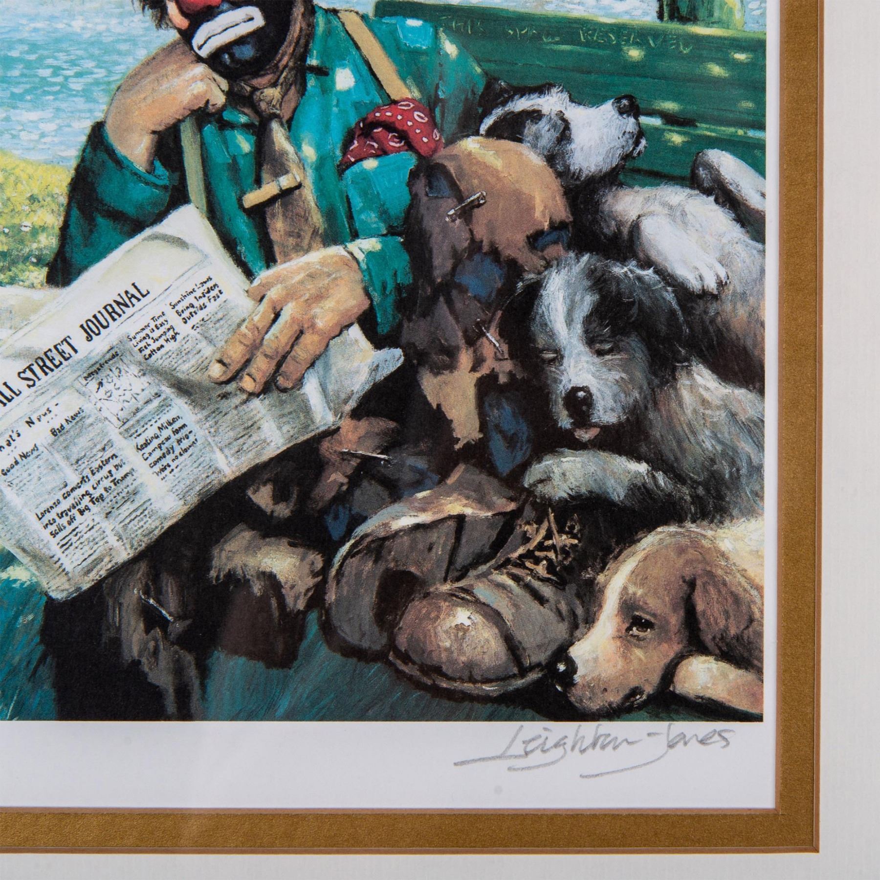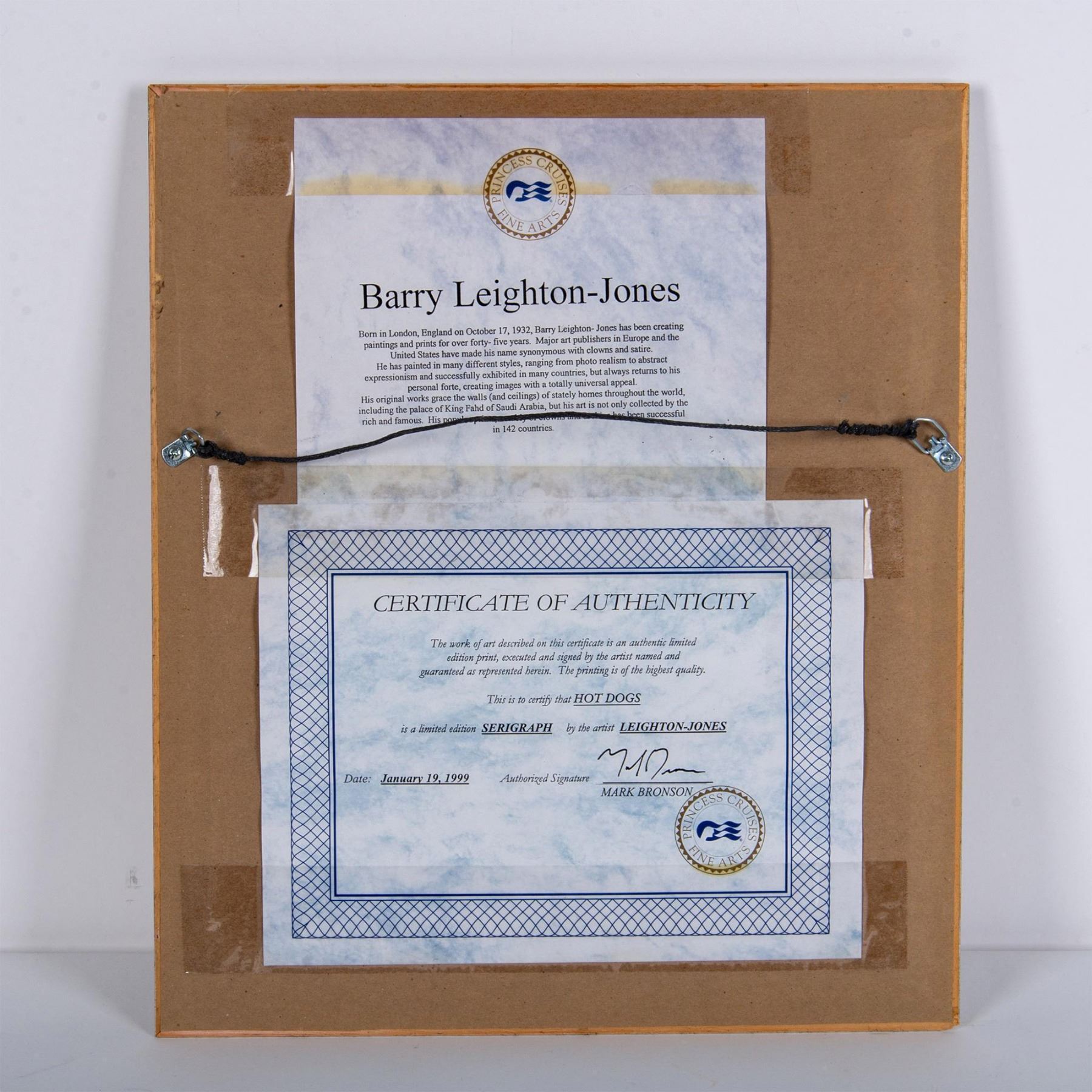 Limited edition color serigraph on paper entitled Hot Dogs by British artist Barry Leighton-Jones depicting a clown in a park with his dogs. Graphite signature on lower right: Leighton-Jones. Edition number on lower left: A/P (Artist Proof.) Housed in a marbleized frame with a white mat. Sight size: 6"L x 8.75"H. Frame dimensions: 14.75"L x 17.25"H x 0.75"W. Certificate of Authenticity included. Artwork can be unframed and rolled for shipment.