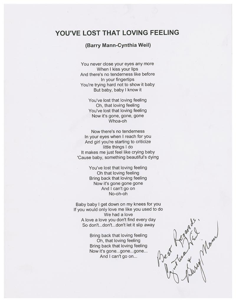 Souvenir printed lyrics to ‘You’ve Lost That Loving Feeling’ on an off-white 8.5 x 11 sheet, signed at the bottom in black ink, “Best regards, Cynthia Weil,” and “& Barry Mann.” In very fine condition.