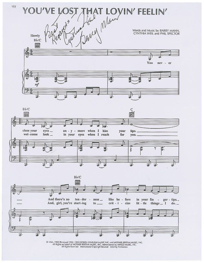 Sheet music for ‘You’ve Lost that Lovin’ Feelin’ one page, 8.5 x 11, signed in black ink at the top, “Best Regards, Cynthia Weil” and “Barry Mann.” In fine condition, with light corner creasing, with heavier creasing to the top left corner, lightly affecting the signatures.
