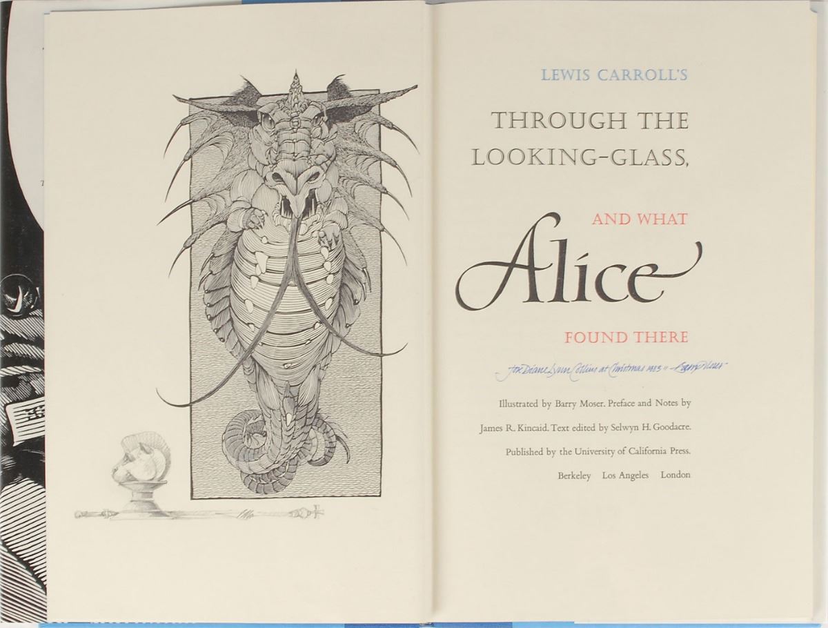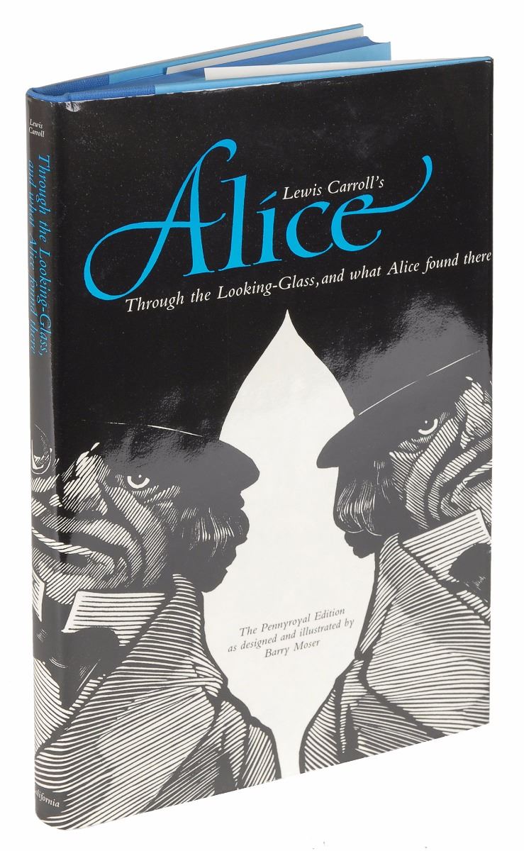 Signed book: Through the Looking–Glass (And What Alice Found There). Pennyroyal Edition. Berkeley, CA: The University of California Press, 1983. Hardcover with dust jacket, 9 x 13.75, 167 pages. Signed and inscribed on the title page in blue ink, “For Diane Lynn Collins at Christmas 1985, Barry Moser,” who adds a wonderful pencil sketch of a scepter and chess piece on the illustrated page opposite the title page. In fine condition.