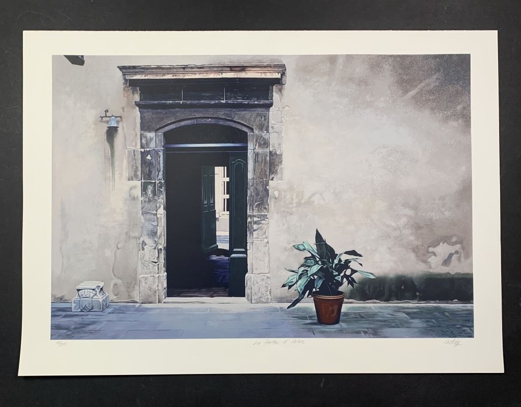Barry Oretsky's "La Porte d'Arles" limited edition print, signed and dated lower right, and numbered 131/275 lower left. This piece is a wall with a doorway, and a potted plant in the foreground. This piece is in excellent condition.