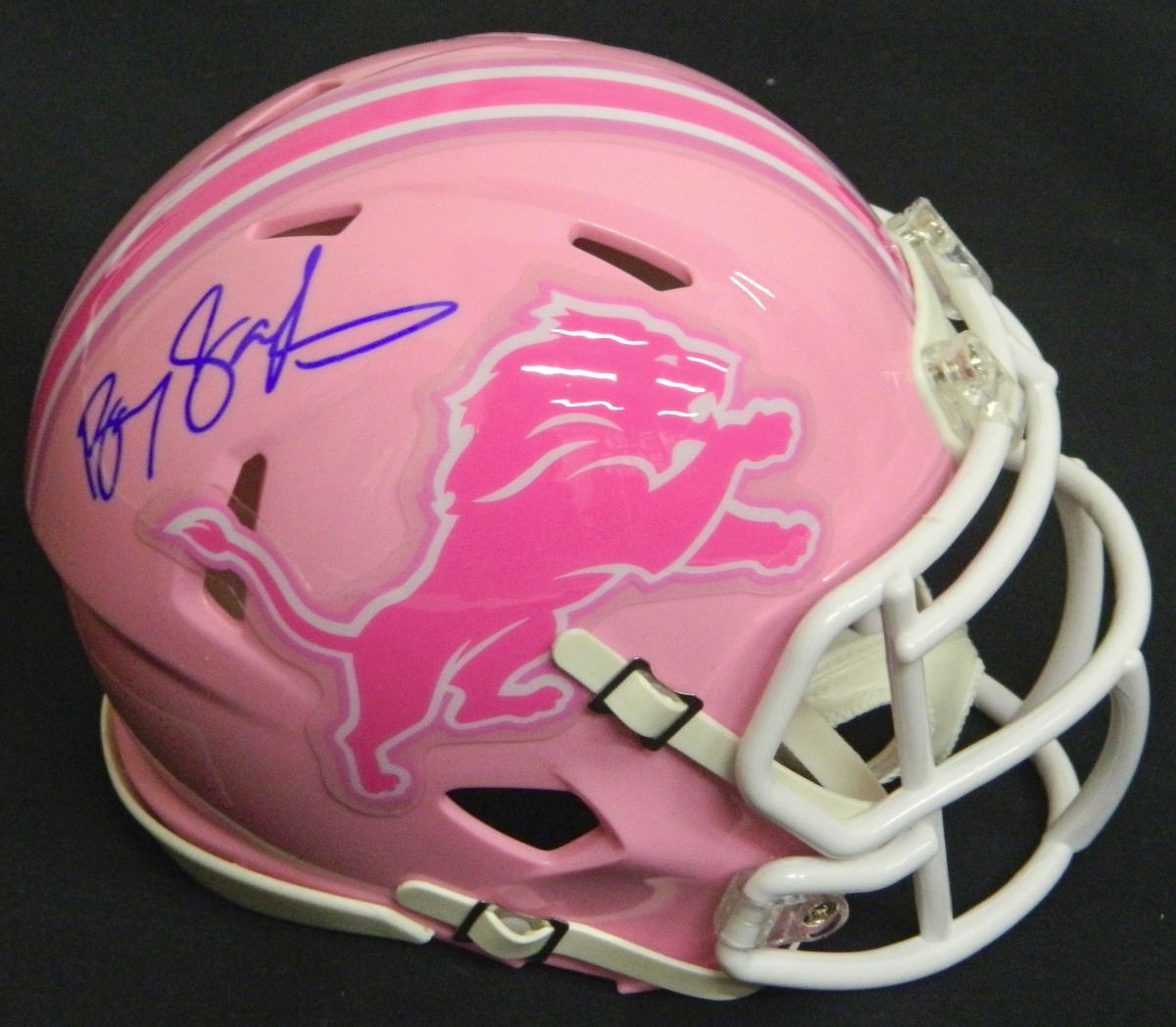 Barry Sanders signed Detroit Lions pink Riddell mini helmet. Item comes with a Schwartz Sports Memorabilia tamper-proof numbered hologram and Certificate of Authenticity which can be verified online.