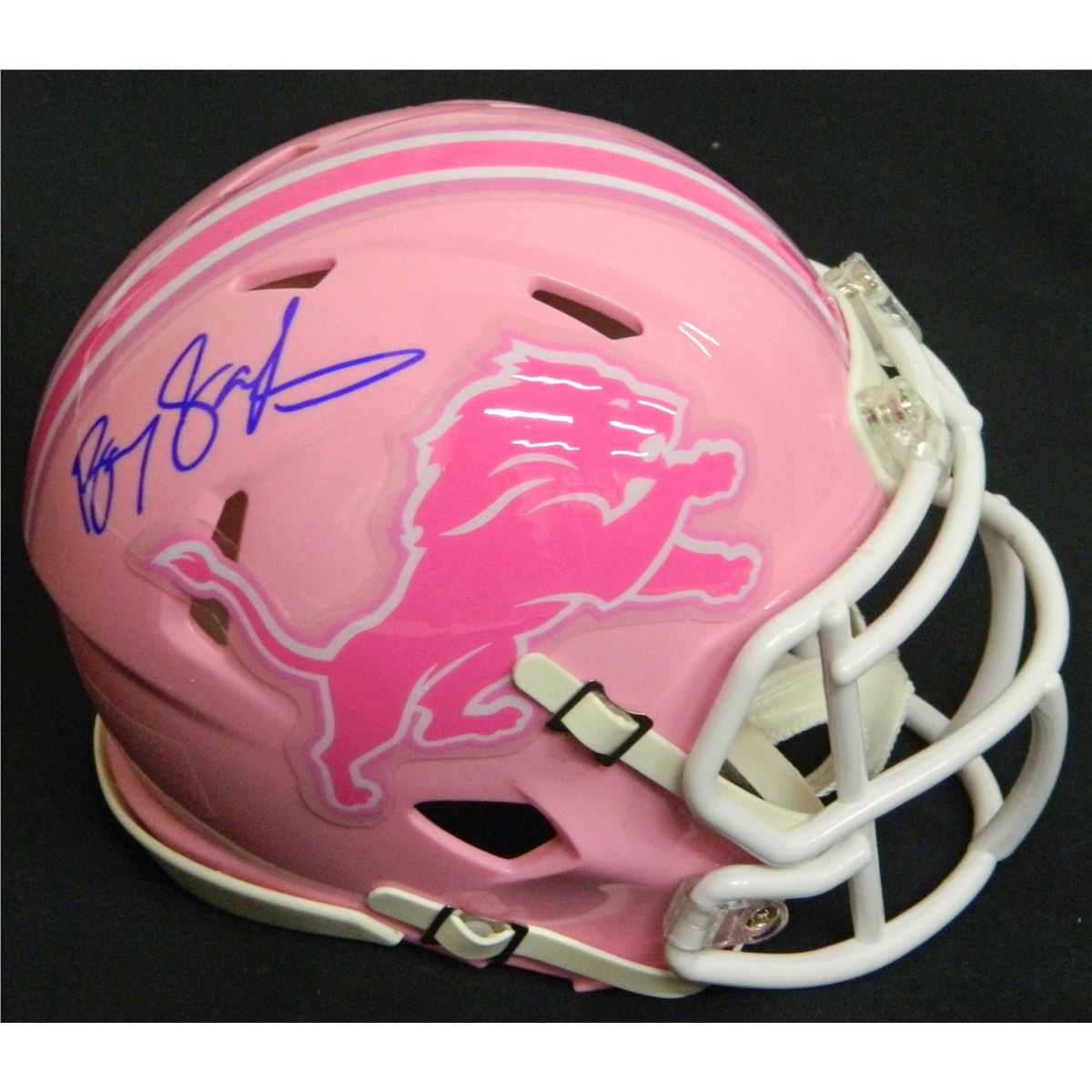 Barry Sanders signed Detroit Lions pink Riddell mini helmet. Item comes with a Schwartz Sports Memorabilia tamper-proof numbered hologram and Certificate of Authenticity which can be verified online.