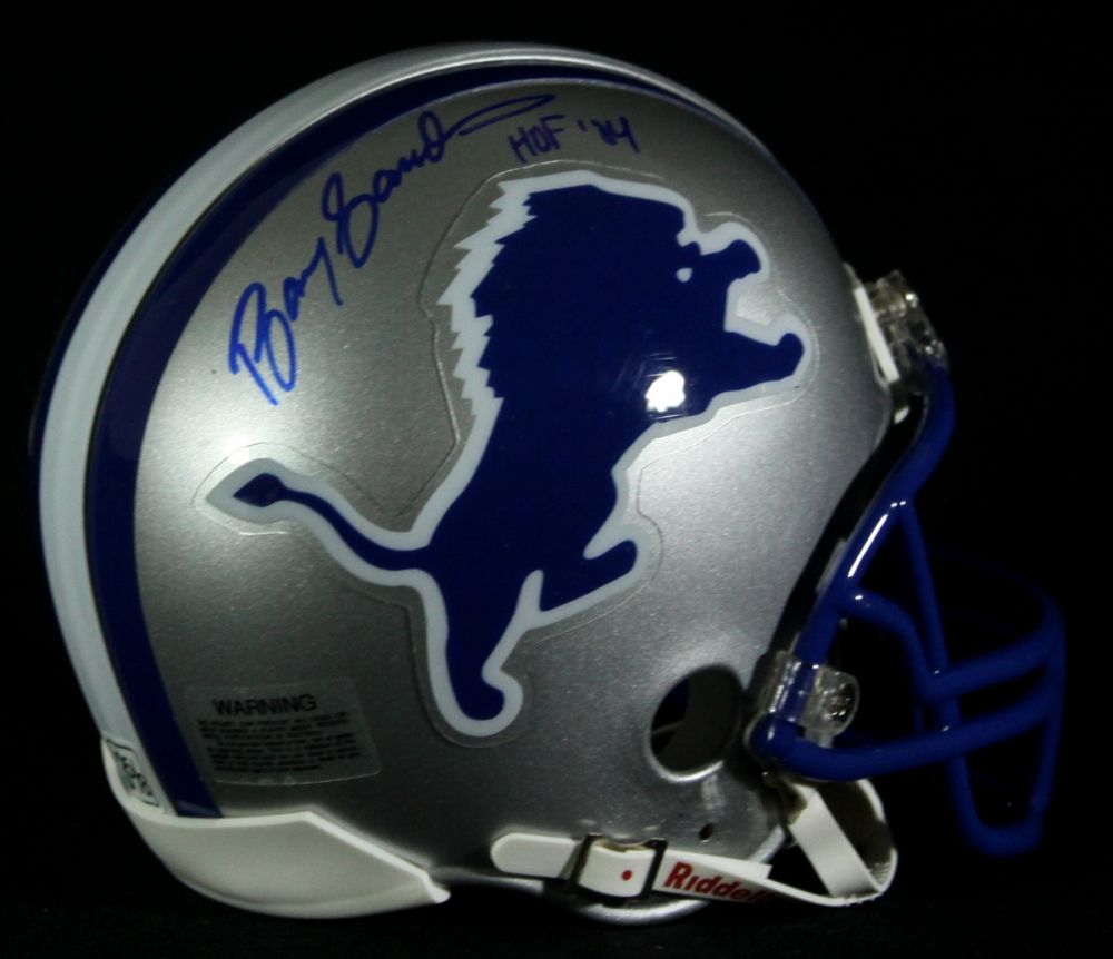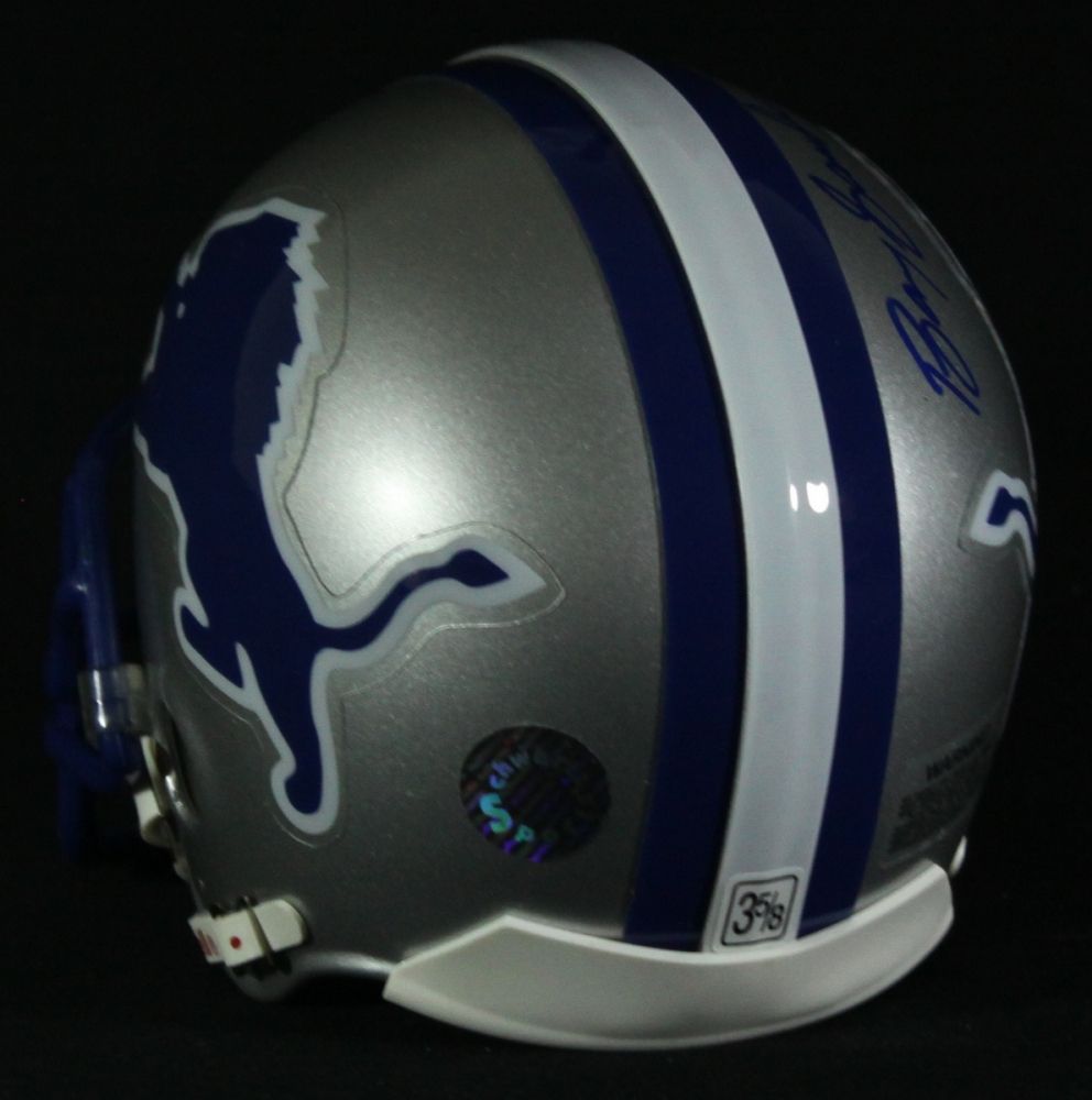 Riddell mini-helmet hand-signed and inscribed in blue felt-tip pen by Barry Sanders. Includes an official Schwartz Sports hologram for authenticity purposes.