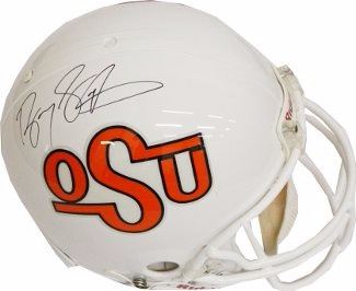 Barry Sanders played for the Oklahoma State Cowboys from 1986 to 1988, and wore the number 21. In 1988, in what has been called the greatest season in college football history, Sanders led the nation by averaging 7.6 yards per carry and over 200 yards per game, including rushing for over 300 yards in four games. He set college football season records with 2,628 yards rushing, 3,249 total yards, 234 points, 39 touchdowns, of which 37 were rushing (also a record), 5 consecutive 200 yard games, scored at least 2 touchdowns in 11 consecutive games, and 9 times he scored at least 3 touchdowns. Sanders also ran for 222 yards and scored 5 touchdowns in his three quarters of action in the Holiday Bowl. Sanders won the Heisman Trophy as the season's most outstanding player. Barry Sanders has hand autographed this Oklahoma State Full Size TB Authentic Riddell Helmet. Schwartz Sports Hologram and Certificate of Authenticity from Athlon Sports.