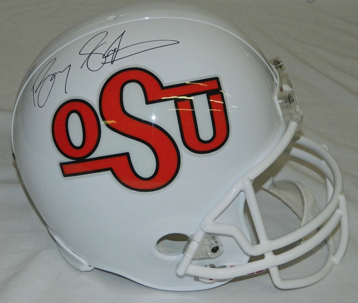 Barry Sanders signed Oklahoma State Riddell Throwback Full-size replica helmet. Item comes with a Schwartz Sports Memorabilia tamper-proof numbered hologram and Certificate of Authenticity which can be verified online.