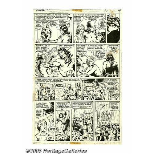 <B>Barry Smith and Sal Buscema - Conan the Barbarian #10, page 13 Original Art (Marvel, 1971).</B></I> Barry Smith was just rounding into form as an artist when this issue was released, and he was well on his way to becoming a fan favorite! And his collaborator Roy Thomas delivered a fantastic original story here, as Conan, who was not infallible, is too late to save his ally Burgun the Gunderman. The other character of note is Jenna, another Thomas creation who appeared in multiple issues as a quasi-love interest for the Cimmerian. It's a powerful page from ""Beware the Wrath of Anu."" The page has an image area of 10"" x 15"". Aside from a few printer's oil stains and tape reside stains at the top and bottom of the page (outside the image area), the art is in Very Good condition. <BR><BR><B>Important notice:</B> Heritage usually auctions material at the rate of 200-250 lots per hour. On some occasions eBay Live bid software or the Internet may not be able to keep up with the pace of the auction. We recommend placing a realistic absentee bid now as insurance to avoid disappointment. Occasionally the auctioneer may eliminate or reject an eBay Live bid, and the auctioneer may also reopen a lot after the close of the eBay live bidding (usually because we missed an audience bid), and may reject your bid even if it shows you as the winning bidder. By bidding via eBay Live, you agree that Heritage may award the lot to another bidder at its sole discretion under the circumstances described above or any other reasonable circumstances. Since eBay bids are not shown to us until we open the lot on the floor, we treat those bids just like floor bids. In most cases the floor responds before the eBay bid is presented to us, due to Internet lag time, so for consistency we have made it a policy that floor bids are always considered first over tie eBay live bids. Also please note that all Heritage lots purchased through eBay Live carry a 20% Buyer's Premium. Please make sure you re
