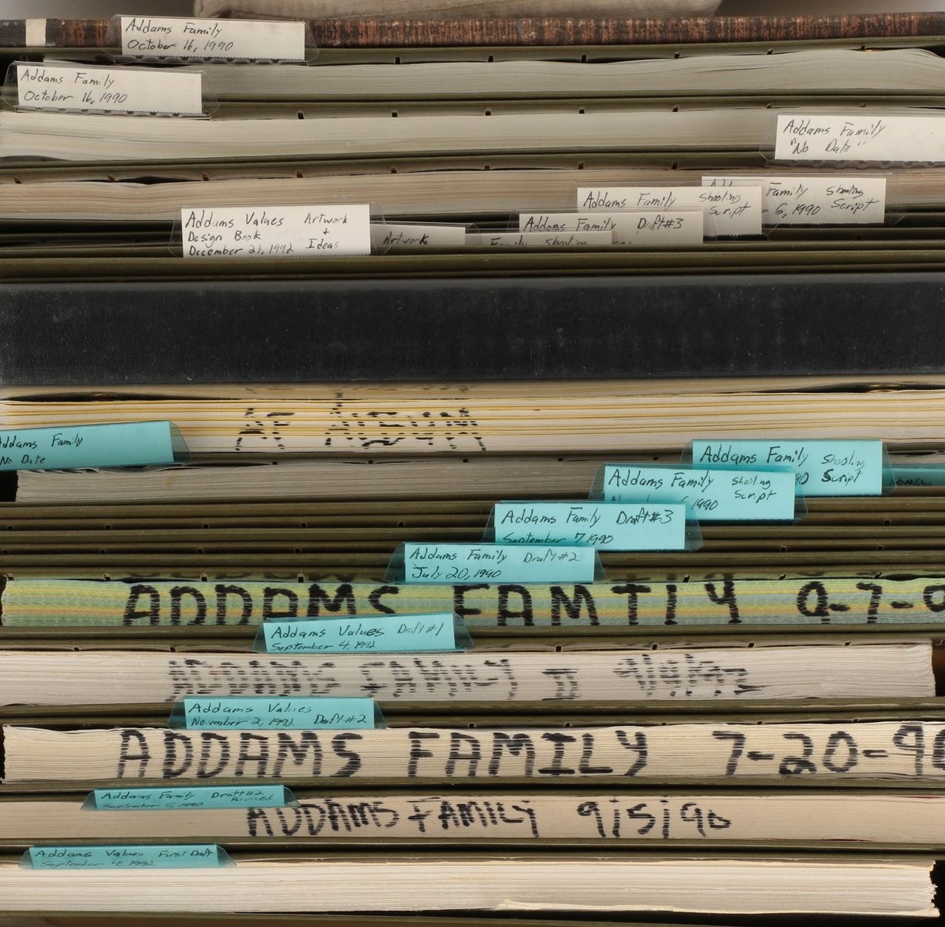 470. Barry Sonnenfeld's (10) The Addams Family and (1) Addams Family Values scripts and concept sketch prints. (1990-1992) Original archive of developing script drafts all dated in tabbed file folders ranging in dates from October 11th, 1990 to September 4th, 1992. Each bradded script averages approx. 120-pages with white paged scripts and multicolor revision paged scripts. A July 20, 1990 2nd Draft script features heavy pencil notation. There is a file marked, "Ideas and Artwork" containing 1-bradded and tabbed "The Addams Family Album" featuring photocopies of Charles Addams' original Addams Family cartoons as inspiration for settings and 1-binder of 10+ black and white and color prints of lavish set and set-piece concepts. A fantastic archive highlighting the genesis of the beloved movie franchise. All signed by Barry Sonnenfeld. Exhibiting age and production wear. In very good condition. From the collection of Barry Sonnenfeld. $600 - $800
