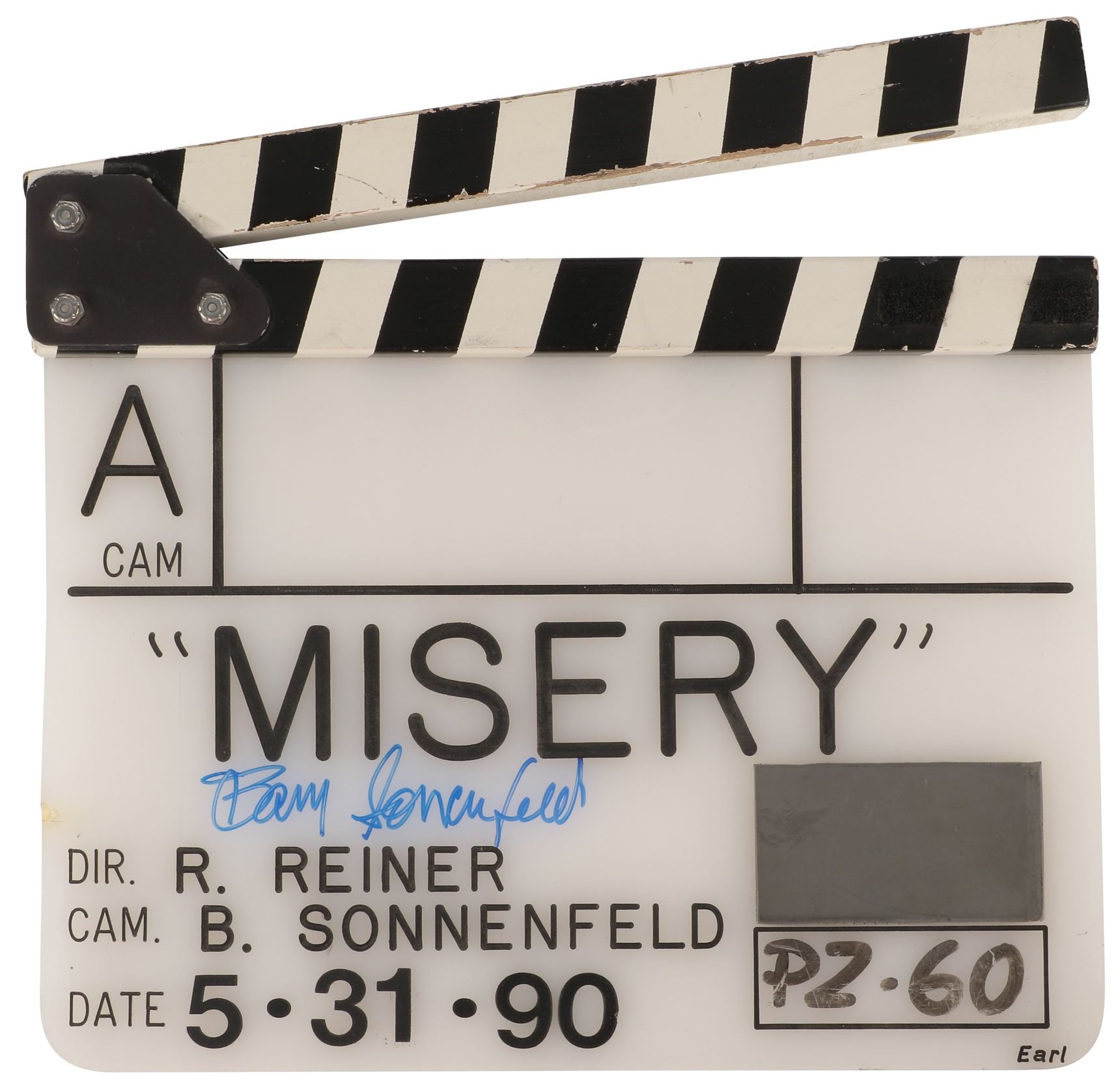 465. Misery clapperboard signed by Barry Sonnenfeld. (Castle Rock, 1990) Original clapperboard measuring approx. 9.5 x 11 in. with plexiglass whiteboard lower etched with "Misery, Dir: R. Reiner, Cam: B. Sonnenfeld", and various other production information, signed in blue ink, "Barry Sonnenfeld". Exhibiting production wear. In very good condition. From the collection of Barry Sonnenfeld. $800 - $1,200