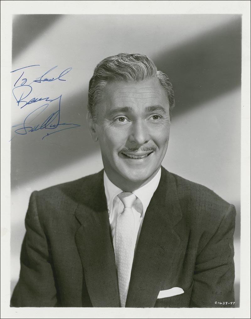 Jovial vintage glossy 8 x 10 photo, signed and inscribed in-person in fountain pen “To Saul, Barry Sullivan.” Reverse of photo bears collector’s ink date notation of October 6, 1954, the date the signature was acquired. In fine condition with light horizontal crease across top of inscription and a few scattered surface marks. Saul Goodman Collection.