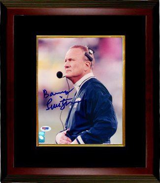 Switzer resurfaced in coaching in 1994 with the Dallas Cowboys. Switzer stepped in following the departure of Jimmy Johnson, who as head coach had won the previous two Super Bowls. Switzer was successful with the Cowboys, going 12–4 his first season in 1994 (losing to the 49ers in the NFC Championship). In Switzer's second season of 1995, the team went 12–4. Dallas won Super Bowl XXX over the Pittsburgh Steelers, 27–17, making Switzer one of only two coaches to win a college national championship and a Super Bowl. Barry Switzer has hand signed this Dallas Cowboys 8x10 Photo. PSA hologram and Certificate of Authenticity. Custom Black Mat and Premium Mahogany Color Frame.