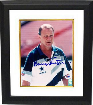 Switzer resurfaced in coaching in 1994 with the Dallas Cowboys. Switzer stepped in following the departure of Jimmy Johnson, who as head coach had won the previous two Super Bowls. Switzer was successful with the Cowboys, going 12–4 his first season in 1994 (losing to the 49ers in the NFC Championship). In Switzer's second season of 1995, the team went 12–4. Dallas won Super Bowl XXX over the Pittsburgh Steelers, 27–17, making Switzer one of only two coaches to win a college national championship and a Super Bowl. Barry Switzer has hand signed this Dallas Cowboys 8x10 Photo. PSA hologram and Certificate of Authenticity. Custom White Mat and Premium Black Frame as shown.