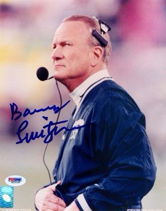 Switzer resurfaced in coaching in 1994 with the Dallas Cowboys. Switzer stepped in following the departure of Jimmy Johnson, who as head coach had won the previous two Super Bowls. Switzer was successful with the Cowboys, going 12–4 his first season in 1994 (losing to the 49ers in the NFC Championship). In Switzer's second season of 1995, the team went 12–4. Dallas won Super Bowl XXX over the Pittsburgh Steelers, 27–17, making Switzer one of only two coaches to win a college national championship and a Super Bowl. Barry Switzer has hand signed this Dallas Cowboys 8x10 Photo. PSA hologram and Certificate of Authenticity.