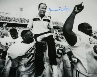 Barry Switzer became head coach at Oklahoma in 1973, leading the team to undefeated seasons that year and the next. Oklahoma won national championships in 1974, 1975 and 1985 under Switzer's leadership. The team won or shared in the Big Eight Conference championship every year from 1973 to 1980. During his sixteen years as head coach at Oklahoma, his teams won eight of the thirteen post-season bowl games they played in, and 54 of his players were selected as All-Americans. Barry Switzer has hand signed this Oklahoma Sooners 16x20 B&W Photo Carried Off Field . Schwartz Sports Hologram and Certificate of Authenticity from Athlon Sports.