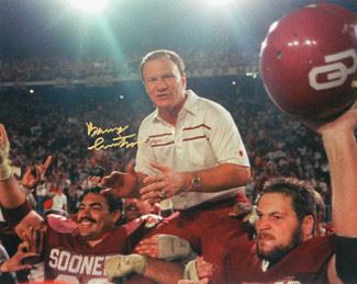 Barry Switzer became head coach at Oklahoma in 1973, leading the team to undefeated seasons that year and the next. Oklahoma won national championships in 1974, 1975 and 1985 under Switzer's leadership. The team won or shared in the Big Eight Conference championship every year from 1973 to 1980. During his sixteen years as head coach at Oklahoma, his teams won eight of the thirteen post-season bowl games they played in, and 54 of his players were selected as All-Americans. Barry Switzer has hand signed this Oklahoma Sooners 8X10 Color Photo Carried Off Field after winning the National Championship in the 1986 Orange Bowl. Schwartz Sports Hologram and Certificate of Authenticity from Athlon Sports.