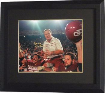 Barry Switzer became head coach at Oklahoma in 1973, leading the team to undefeated seasons that year and the next. Oklahoma won national championships in 1974, 1975 and 1985 under Switzer's leadership. The team won or shared in the Big Eight Conference championship every year from 1973 to 1980. During his sixteen years as head coach at Oklahoma, his teams won eight of the thirteen post-season bowl games they played in, and 54 of his players were selected as All-Americans. Barry Switzer has hand signed this Oklahoma Sooners 8X10 Color Photo Carried Off Field after winning the National Championship in the 1986 Orange Bowl. Schwartz Sports Hologram and Certificate of Authenticity from Athlon Sports. Custom Black Mat and Premium Black Color Framed as shown.