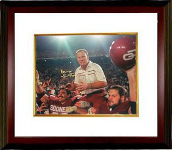 Barry Switzer became head coach at Oklahoma in 1973, leading the team to undefeated seasons that year and the next. Oklahoma won national championships in 1974, 1975 and 1985 under Switzer's leadership. The team won or shared in the Big Eight Conference championship every year from 1973 to 1980. During his sixteen years as head coach at Oklahoma, his teams won eight of the thirteen post-season bowl games they played in, and 54 of his players were selected as All-Americans. Barry Switzer has hand signed this Oklahoma Sooners 8X10 Color Photo Carried Off Field after winning the National Championship in the 1986 Orange Bowl. Schwartz Sports Hologram and Certificate of Authenticity from Athlon Sports. Custom White Mat and Premium Mahogany Color Framed as shown.
