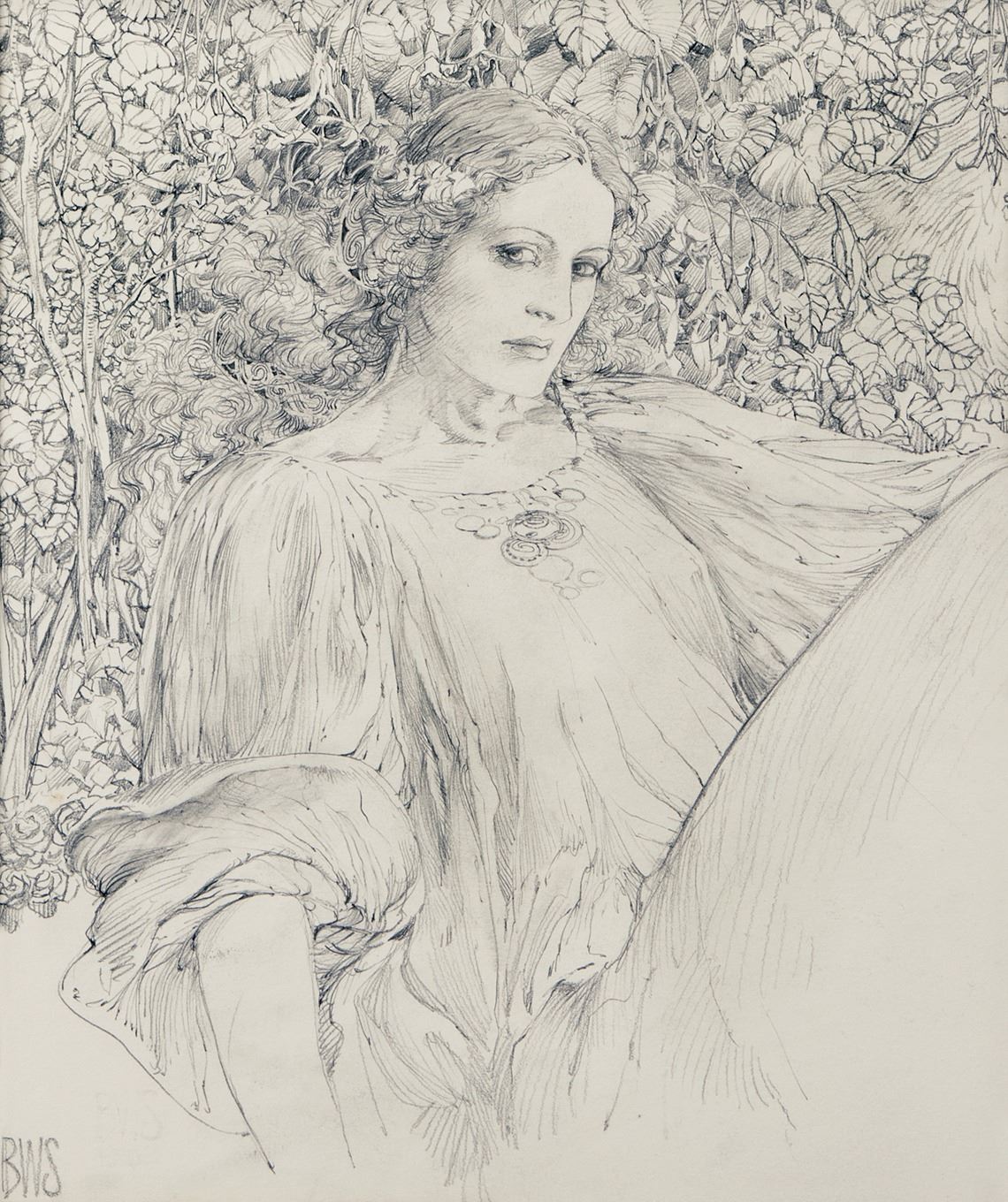 100. Barry Windsor-Smith original cover artwork for the Cygnus portfolio. (Cygnus, 1983) Accomplished in pencil on 10 x 12 in. artist leaf visible through mat. The Drawings of Barry Windsor-Smith is a deluxe box set of eight romantic drawings released by Cygnus in 1983. A portion of this drawing was used as the cover to the box set and is seen here in its entirety. Extremely detailed and beautifully rendered, this elegant work of art showcases BWS' mastery of graphite, possibly his best medium. The work is also known as "Nimue the Enchantress". Signed at lower left, "BWS". Exhibiting minor soiling. In very fine condition. $2,000 - $3,000