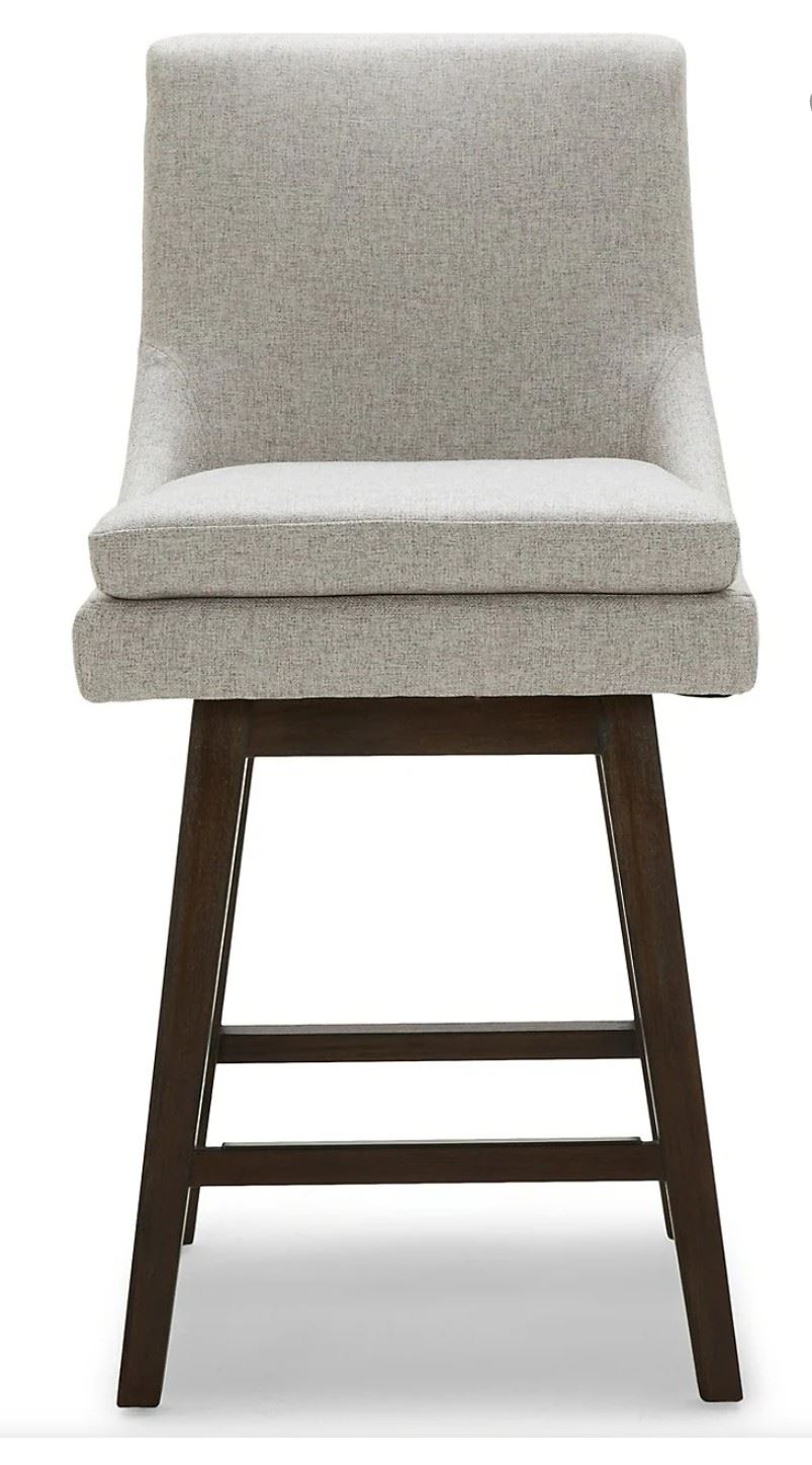 Contemporary design with fabric upholstery, comfortable cushioned seat, dark wooden legs, new.