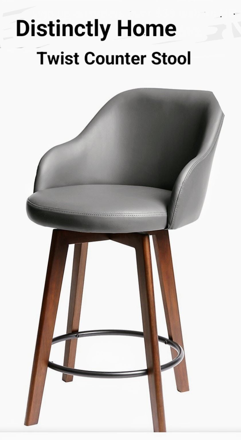 Elegant leatherette twist counter stool, with walnut-finished wood and metal footrest, new.