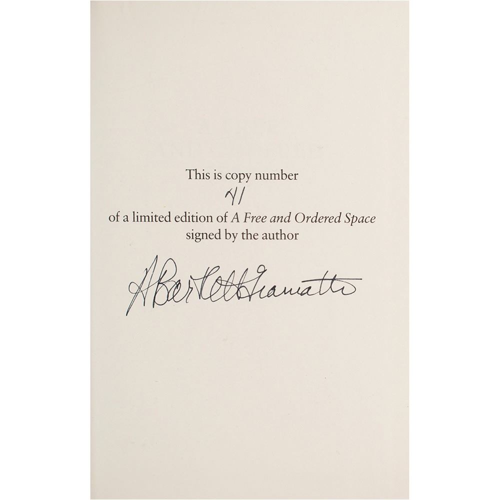 Signed book: A Free and Ordered Space: The Real World of the University. First edition, limited issue, number 41 of an unspecified edition. NY: W. W. Norton, 1988. Hardcover, 6 x 8.5, 306 pages. Signed on the colophon in black felt tip, "A. Bartlett Giamatti." In very fine condition.