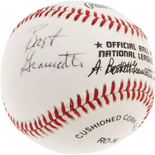 <B>1980's Bart Giamatti Single Signed Baseball.</B></I> Best remembered as the man who levied a lifetime ban against Pete Rose, denying the Hit King a Hall of Fame plaque or managerial job, Giamatti is a particularly tough signature today. This is especially true for single signed baseballs, and his appearance on an ONL ball bearing his own name is quite a rare find. He even signs so as to allow simultaneous display of both his handwritten and facsimile autographs. Signature rates 9/10, and the ball itself is equally strong. <I>LOA from PSA/DNA.</B></I>