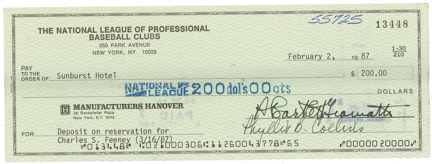 Former president of Yale University who served as Major League Baseball’s National League president from 1986 to 1988 and as baseball commissioner from 1988 until his death in 1989. Best-known for imposing the lifetime ban on Pete Rose as the result of Rose’s gambling activities. National League of Professional Baseball Clubs business check, 8.25 x 3, filled out in type and signed by Giamatti, “A. Bartlett Giamatti,” payable to Sunburst Hotel for $200.00, February 2, 1987. Typed memo indicates “Deposit on reservation for Charles S. Feeney.” In fine condition, with show-through from stamps on reverse, one under last name of signature.