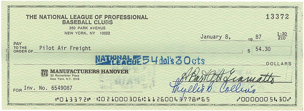 Former president of Yale University who served as Major League Baseball’s National League president from 1986 to 1988 and as baseball commissioner from 1988 until his death in 1989. Best-known for imposing the lifetime ban on Pete Rose as the result of Rose’s gambling activities. National League of Professional Baseball Clubs business check, 8.25 x 3, filled out in type and signed by Giamatti, “A. Bartlett Giamatti,” payable to Pilot Air Freight for $54.30, January 8, 1987. In fine condition, with light show-through from stamps on reverse.