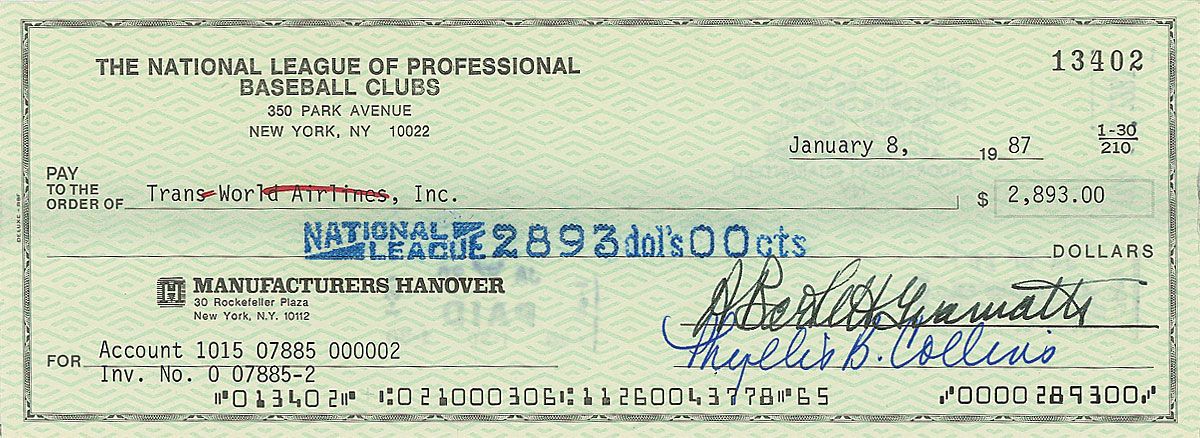 National League of Professional Baseball Clubs business check, 8.25 x 3, filled out in type and signed by Giamatti, “A. Bartlett Giamatti,” payable to Trans World Airlines, Inc. for $2893, January 8, 1987. In fine condition, with expected bank stamps and notations (not affecting the signature or overall appearance).